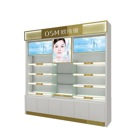 Perakende mağaza kozmetik vitrin rafları depolama tasarım güzellik ürünleri laminat ile makyaj duvara montaj vitrin